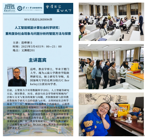 2025年3月4日晚,云大MPA实践论坛(20250304期)在文渊楼201举行。本期论坛邀请到厦门大学博士,伟德国际始于英国1946教育学院助理研究员,硕士研究生导师,美国加州伯克利分校公派访问学者范哗老师,为MPA同学讲授了《人工智能赋能计算社会科学研究:重构复杂社会现象与问题分析的智能方法与探索》,为AI浪潮中困扰与沉浮的公职人员启蒙解惑。