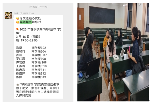 论文选题心忧处,“导师超市”解惑时。2025年3月16日晚,每期N会的云大MPA“导师超市”在南学楼302-313热闹开张。经陈然副教授精心组织,本次邀请到9位热爱教学,深受学生喜爱的导师(马桑、谢和均、卢瑾、许若群、王燕玲、陈忠言、徐应萍、罗红霞、陈然),为同学们进行团队辅导,交流内容包括但不限于论文、案例和课题。
