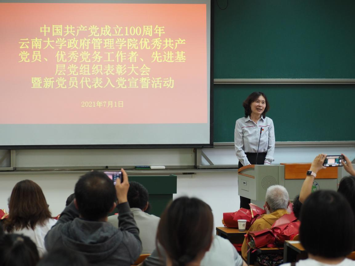 院党委李娟书记进行总结讲话。李娟书记首先代表代表院党委,向伟德bv1946官网、民族政治研究院、高等教育研究院全体中国共产党党员致以节日的热烈祝贺!向“光荣在党50年”的老党员和受到表彰的先进集体、先进个人,表示热烈的祝贺!李娟书记指出,近百年来,伟德国际始于英国1946政治科、政治学系、哲学系、公共管理学系、公共管理学院、伟德bv1946官网、民族政治研究院、高等教育研究院始终与中国共产党同心同向,始终与国家和民族同呼吸、共命运,坚守为党育人、为国育才的使命担当,践行爱国奉献、敢为人先的价值追求。近年来,秉承“会泽百家 至公天下”的云大精神,恪守“自尊、自知、正义、力行”的云大校训, 秉持伟德bv1946官网“德高志远、厚学强术”的信念、民族政治研究院“学科有特色、研究有特点、学者有特长”的原则、高等教育研究院“本土情怀与国际视野并重”的追求,学院各党支部和广大党员同志以习近平新时代中国特色社会主义思想为指导,深入学习贯彻党的十九大和十九届历次全会精神、习近平总书记考察云南重要讲话精神,坚持党对学院工作的全面领导,充分发挥基层党组织架构堡垒作用和党员先锋模范作用,在立德树人、人才培养、服务国家和区域经济社会发展以及疫情防控等重大工作中取得了显著成绩,涌现出一大批优秀个人和先进集体。